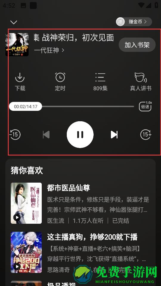 3、进入一代狂神详情页后,点击底部立即收听按钮,开始收听。