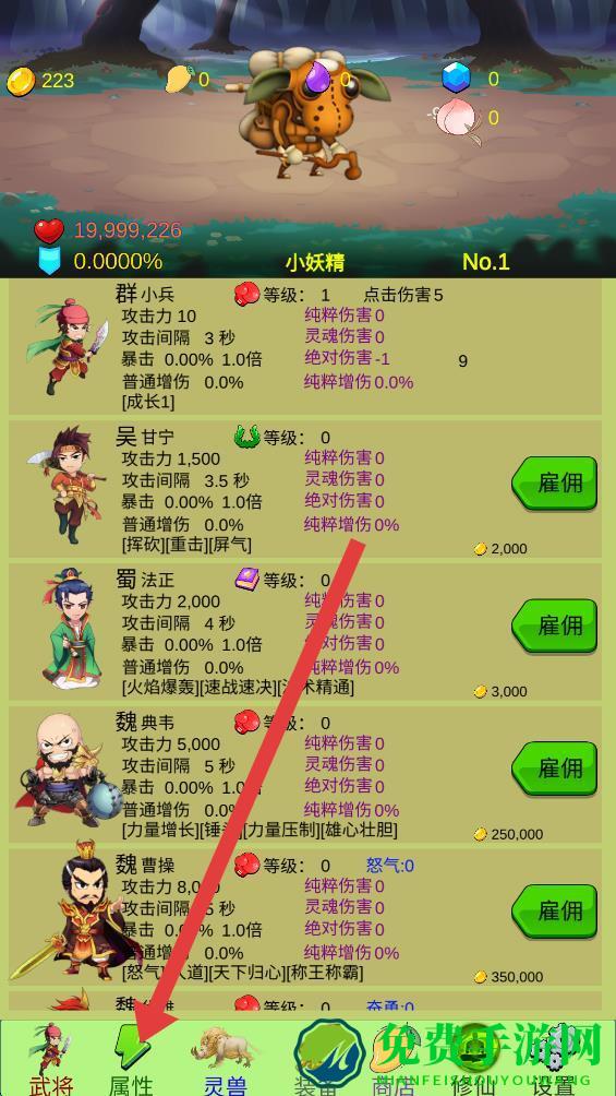 1、在游戏主页面,点击下方的属性选项。