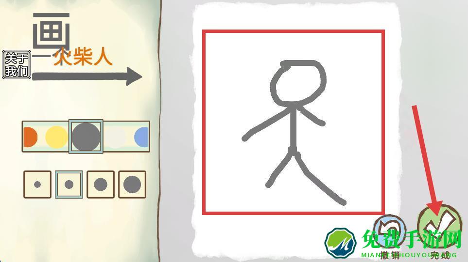1、进入游戏后,在画板上用线条勾勒出火柴人的形象,画好后点击右下角完成按钮。