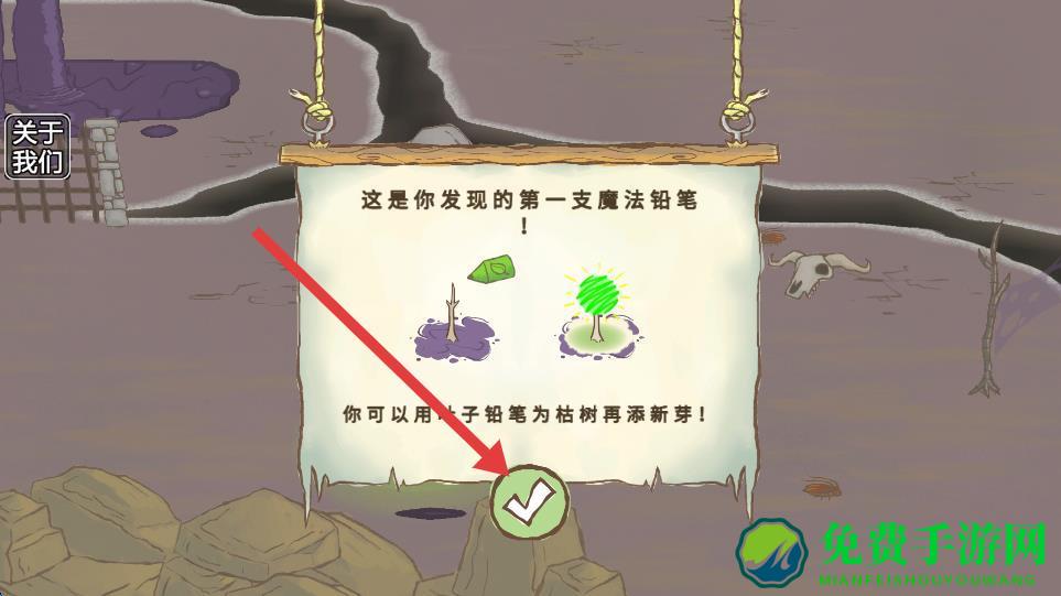 4、阅读完魔法铅笔的提示信息后,点击提示界面下方的对勾按钮,确认并继续游戏。