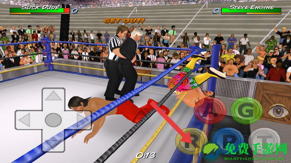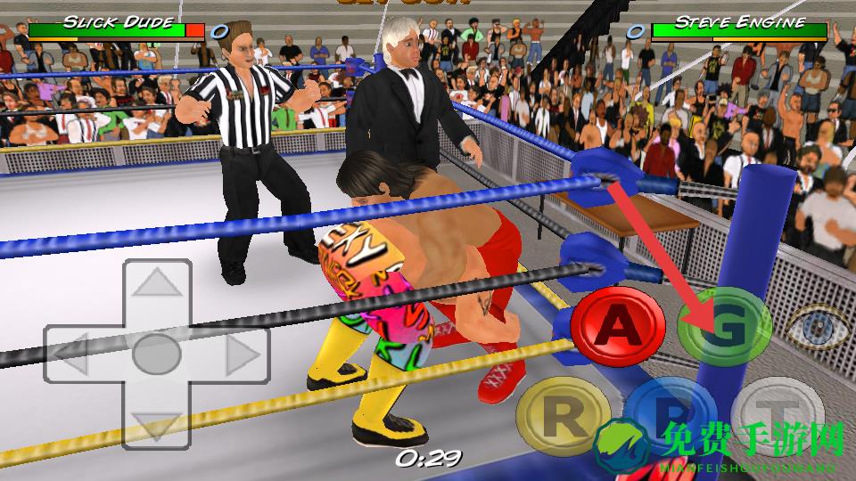 3、在与对手近身周旋时,点击箭头指向的A按键,施展对应的摔跤招式,给对手造成伤害或控制效果。