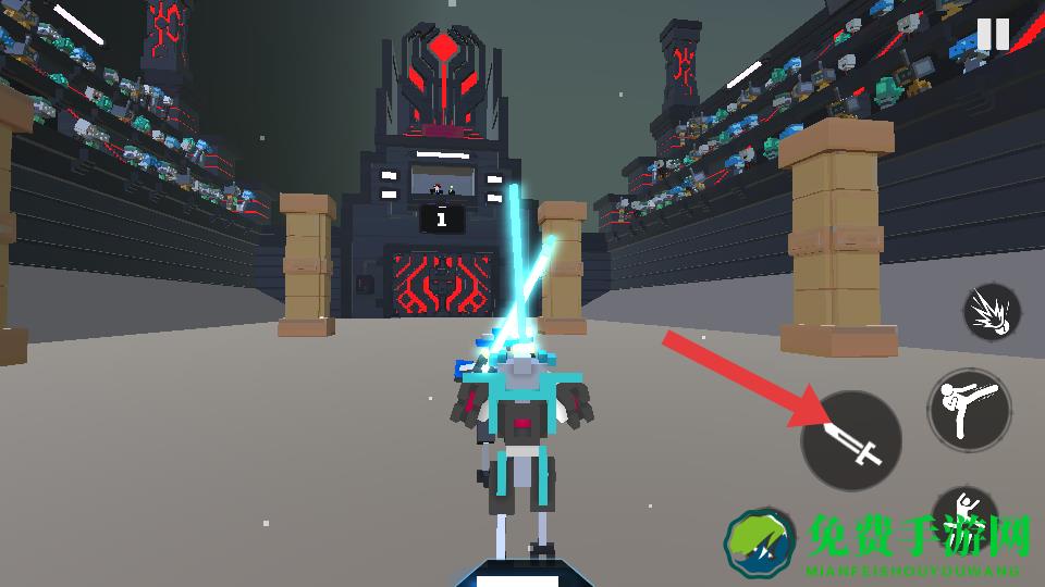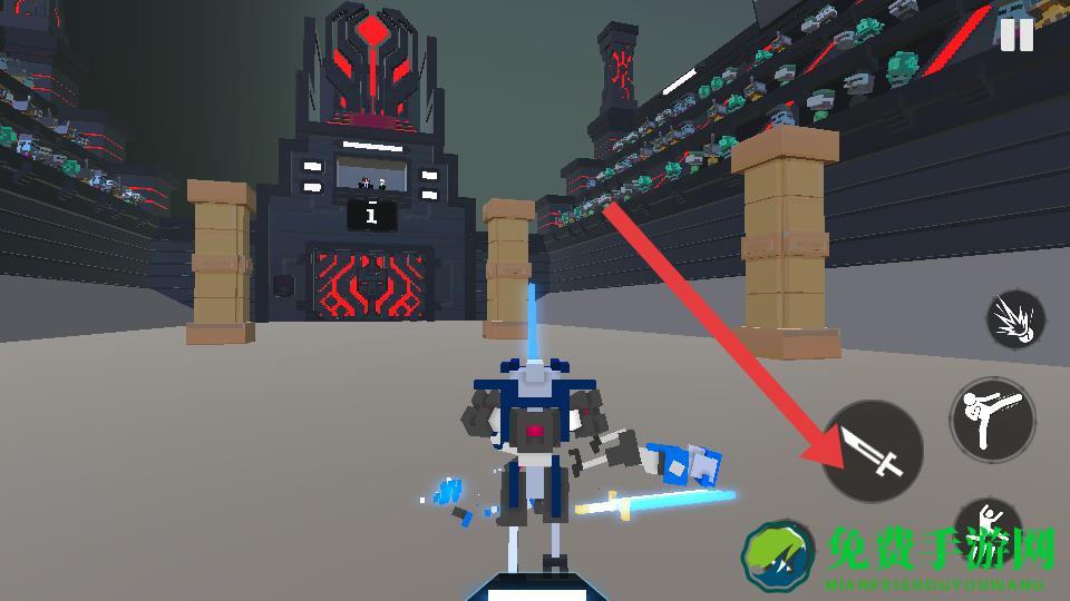 2、靠近敌人后,需点击箭头指向的剑形攻击按钮,使用机甲的近战的武器对敌人发起基本攻击,造成伤害。