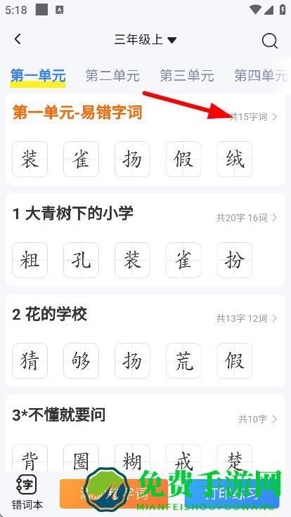 2、点击第一单元-易错字词,进入易错字词详情页面。