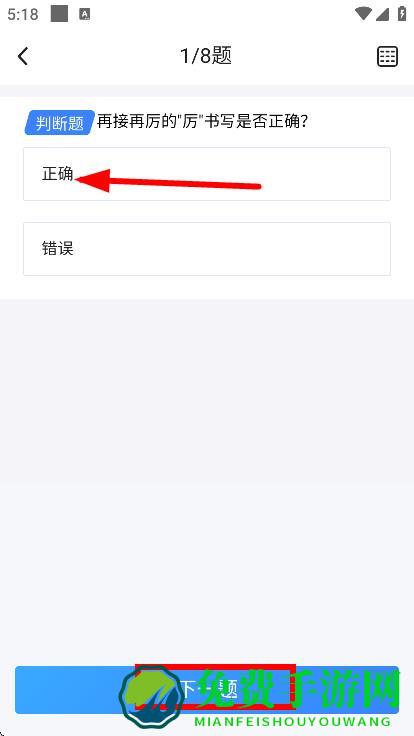 4、根据题目选择答案,然后点击下一题继续练习。