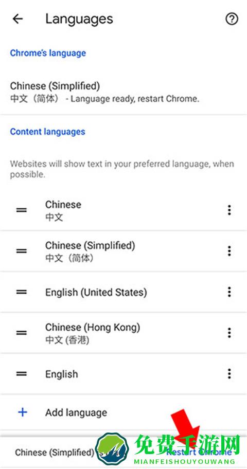 6、选择后会回到上一个界面,并且下方弹出重启Chrome的提示,我们点击【Restart Chrome】即可,之后重启谷歌app,我们就可以发现软件内已经变成中文界面了。