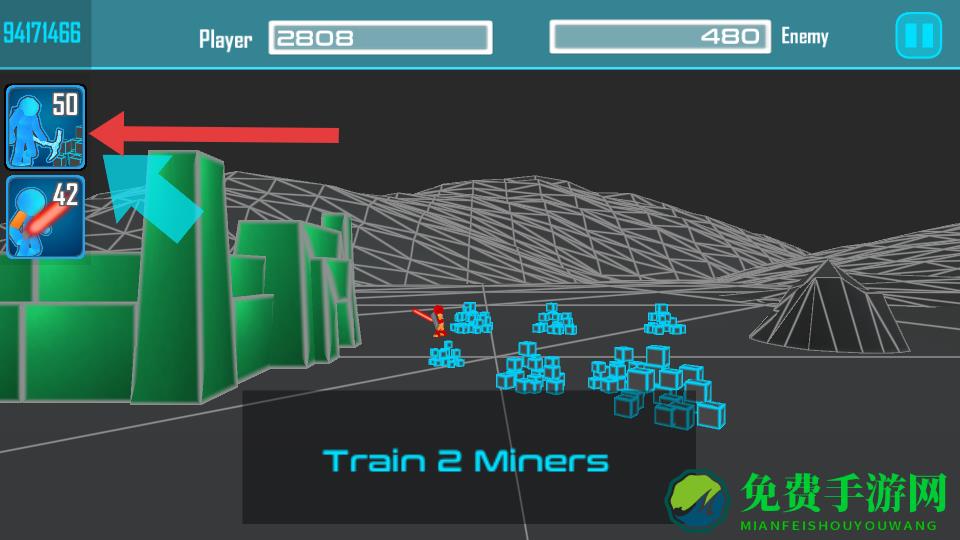 2、点击箭头指向的矿工训练图标,训练矿工单位,矿工可用于采集资源,为后续训练战斗单位、提升战力提供资源支持。