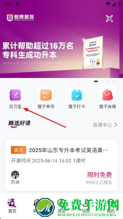 1、在软件首页,点击自习室,进入自习室页面。