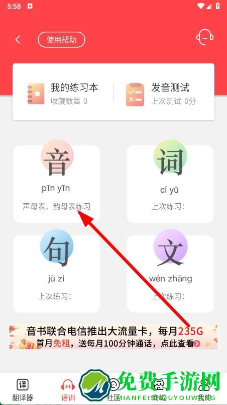 2、在语训页面,点击声母表、韵母表练习选项,进入拼音训练页面。