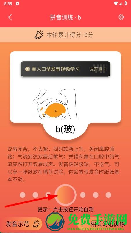 4、查看b的发音图示、文字说明,点击下方按钮开始自测,点击发音示范听取发音示例,进行b的拼音训练。