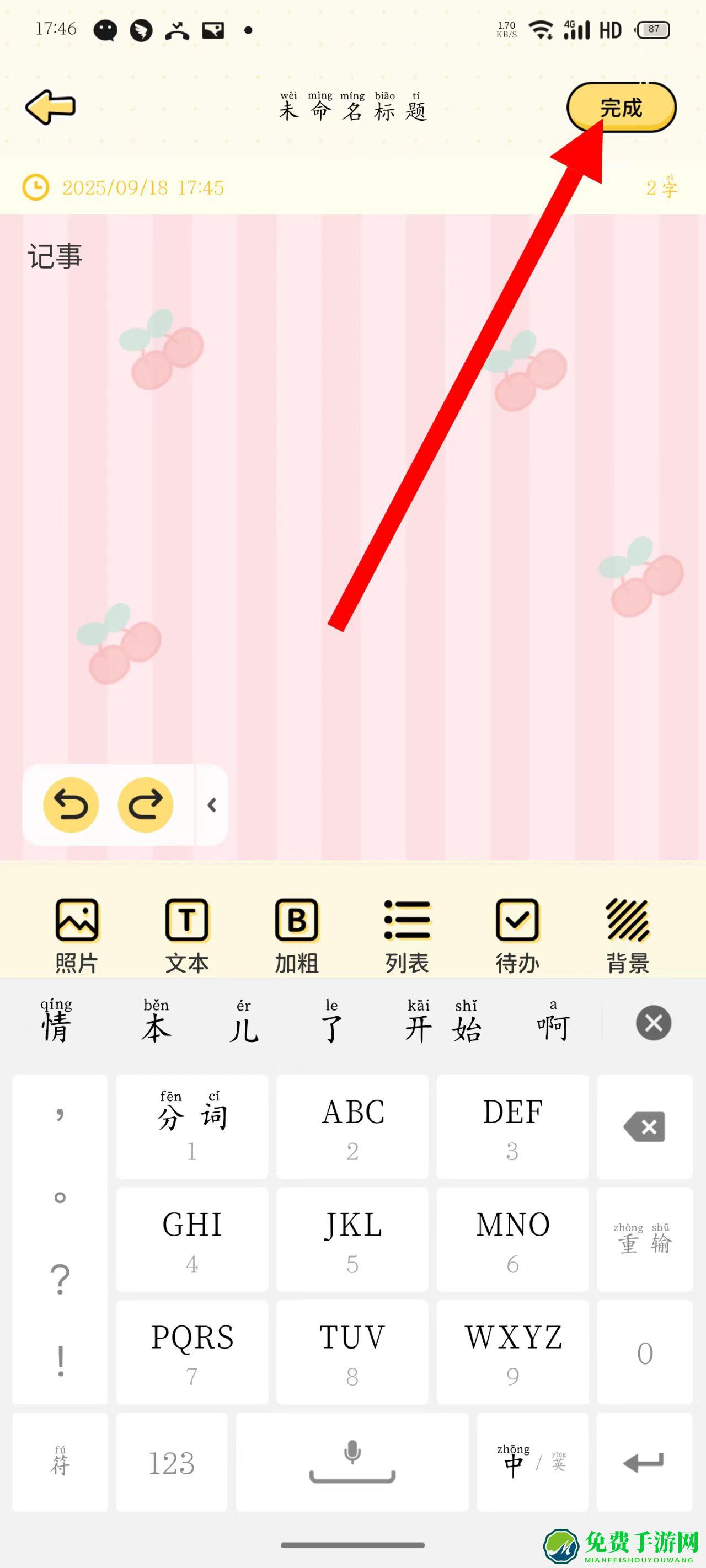 4、编辑完成后,点击右上角完成按钮,即可保存该记事本。