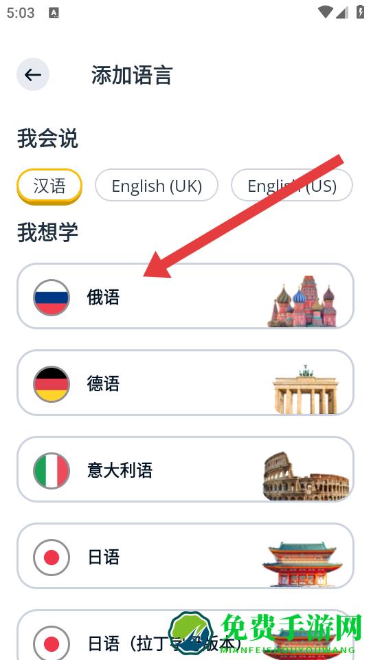 3、在添加语言的页面,需要选择想要学习的目标语言如俄语等。