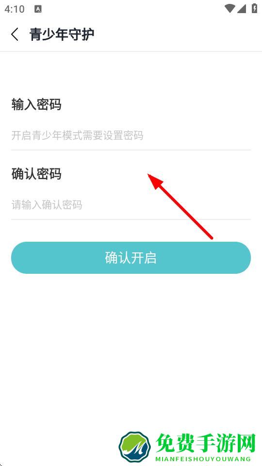 4、在青少年守护页面,输入并确认密码后,点击确认开启即可打开青少年模式。