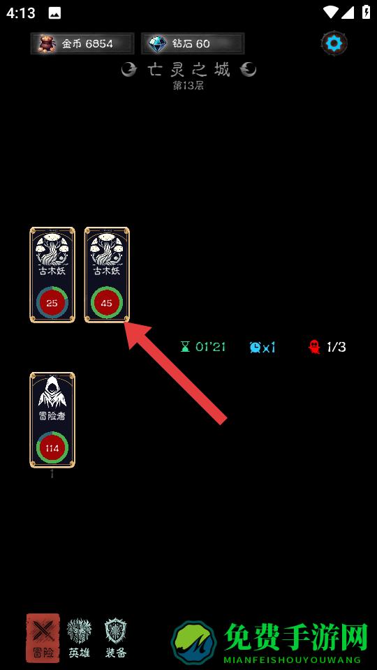 1、在亡灵之城第13层冒险时,遇到箭头指向的古木妖敌人,可选择与其战斗,击败敌人获取经验,推进地牢探索。