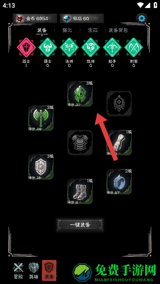 2、进入装备界面,看到箭头指向的装备如3级头盔,可点击查看装备属性,考虑是否为角色更换该装备,提升角色战力。
