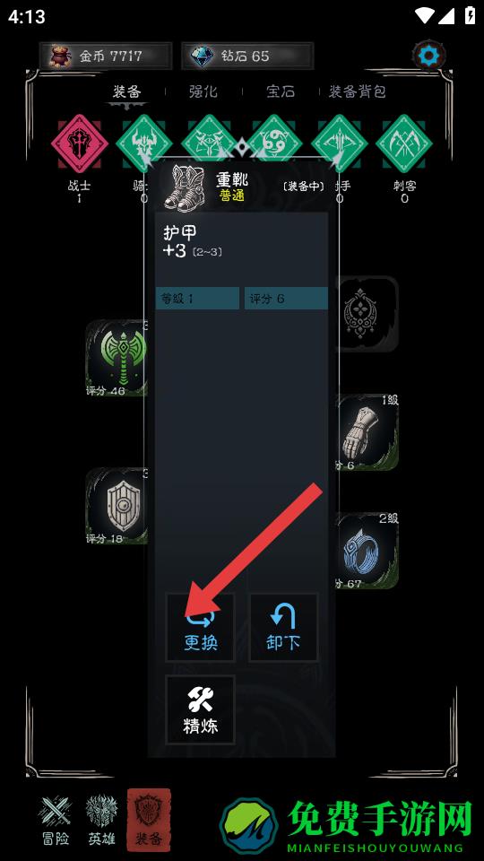 3、在装备详情界面,若当前装备如重靴需要更换,点击箭头指向的更换按钮,可选择其他更合适的装备为角色的配备。