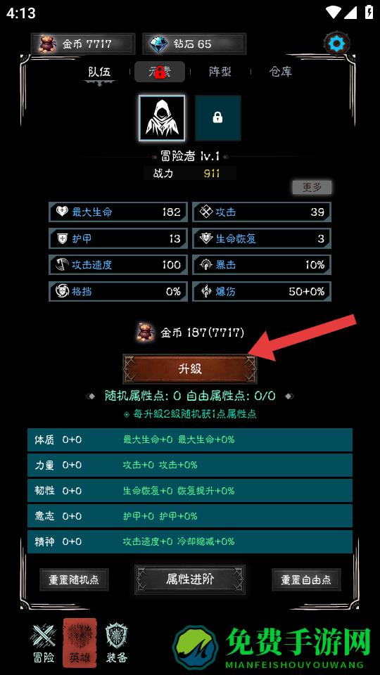 4、在英雄界面,点击箭头指向的升级按钮,消耗金币为冒险者角色升级,提升角色等级,增强角色在冒险中战斗能力。