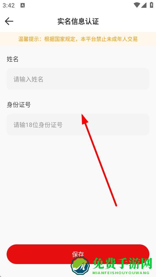 4、在实名信息认证页面,输入姓名和身份证号,点击保存完成实名认证。
