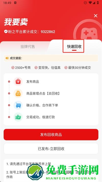3、而快速回收是将自己的账号可以直接进行回收,发布后会有想要回收的用户前来联系自己进行快速回收;