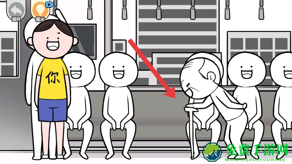 1、在地铁场景中,看到箭头指向的需要帮助的老人时,可进行互动,比如主动让座,完成善意行为相关的游戏任务。