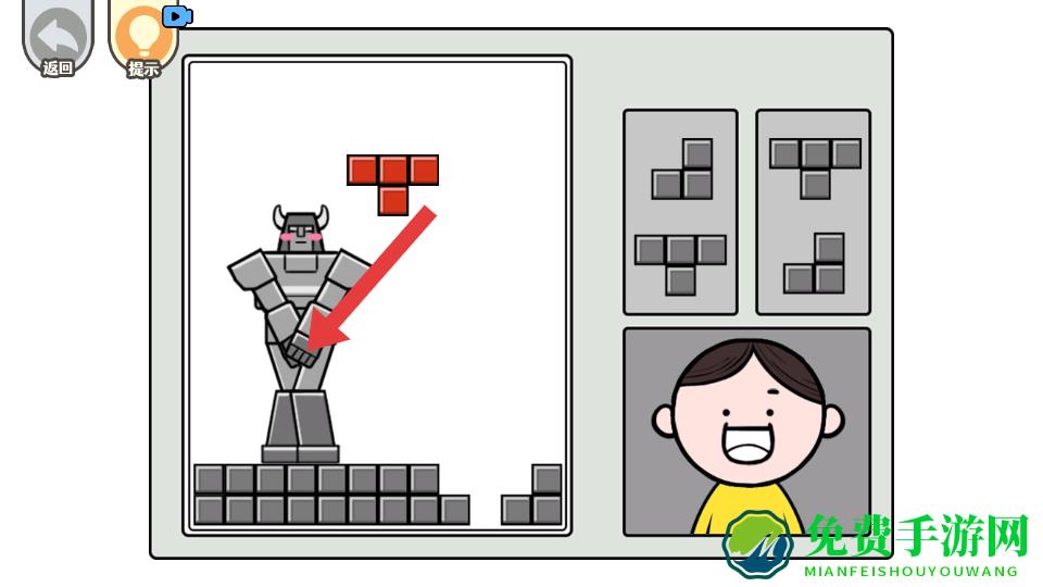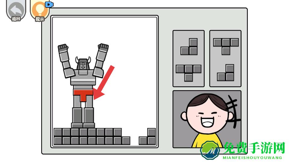 2、在机器人拼图关卡,按照箭头指示,将红色方块放置到机器人对应的部位,逐步完成机器人的组装,推进解谜进程。