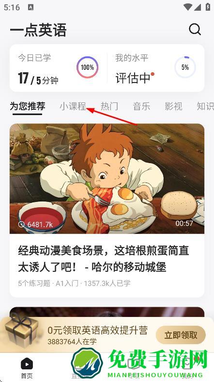 2、进入软件后,在首页点击小课程,进入小课程页面。