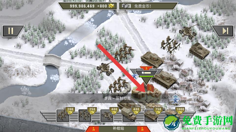 2、合理运用步兵单位执行压制坦克任务,在补给站区域部署兵力,实现对敌方坦克的有效牵制。