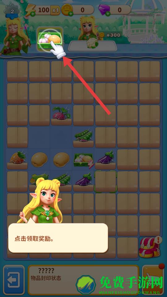 1、点击领取奖励区域的蔬菜道具,获取初始资源,为后续蔬菜合并和经营做准备,同时留意上方的金币、钻石等资源增长。