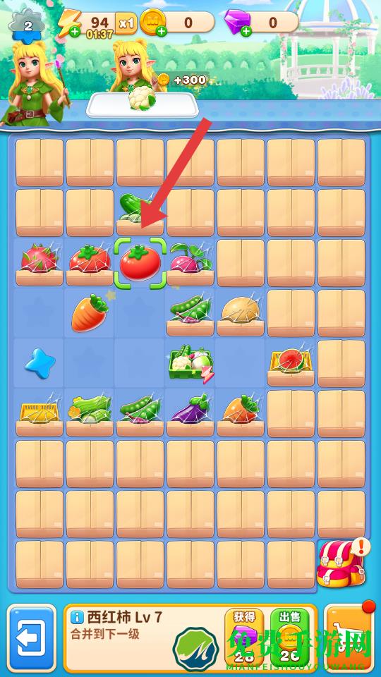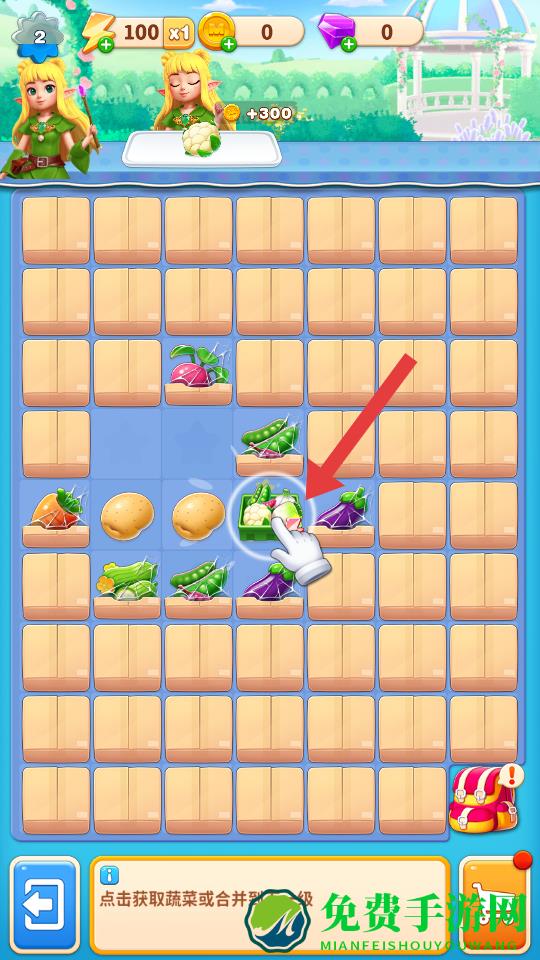 2、点击获取蔬菜或合并到下一级,将相同的蔬菜合并升级,提升蔬菜等级,解锁更高价值的蔬菜种类,增加资源获取效率。