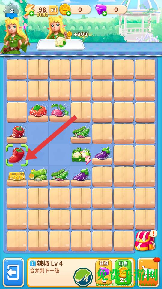 3、将辣椒等蔬菜合并升级如Lv4,可选择出售获取金币或继续合并到下一级,根据资源需求合理选择操作,积累财富。