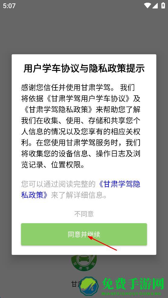 1、打开应用,会弹出“用户学车协议与隐私政策提示”页面,仔细阅读相关内容后,点击“同意并继续”按钮,进入应用主界面。