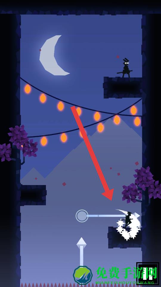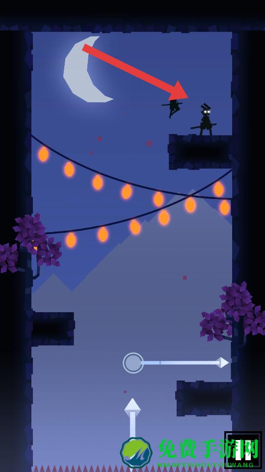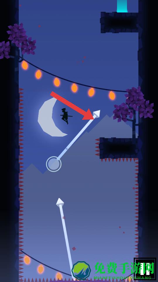 1、基础跳跃与瞄准操作:按住屏幕拖动手指确定跳跃方向与力度,释放手指后忍者跃起,跳至墙面或地面会自动粘住,需要瞄准无钉子的区域,避免触发了危险。