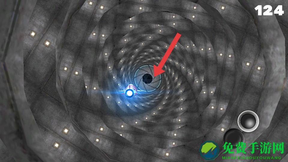 2、在螺旋隧道场景中,继续瞄准中心的黑色洞口区域,调整飞机飞行轨迹,避免碰撞隧道壁,持续积累分数如124分。