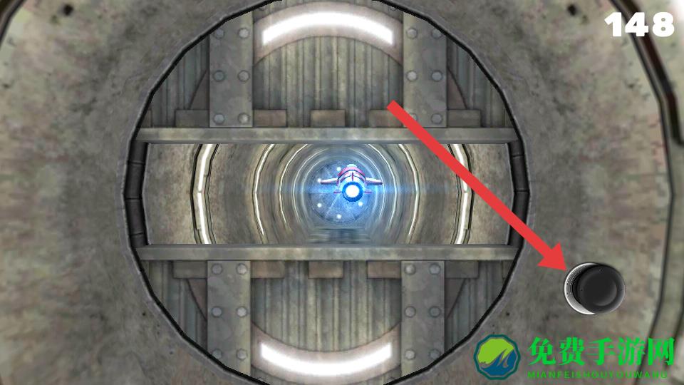 4、通过右侧的虚拟摇杆操控飞机,在带有金属栏杆的隧道中,灵活调整飞行方向,避开障碍物,顺利飞向中心的蓝色光圈。