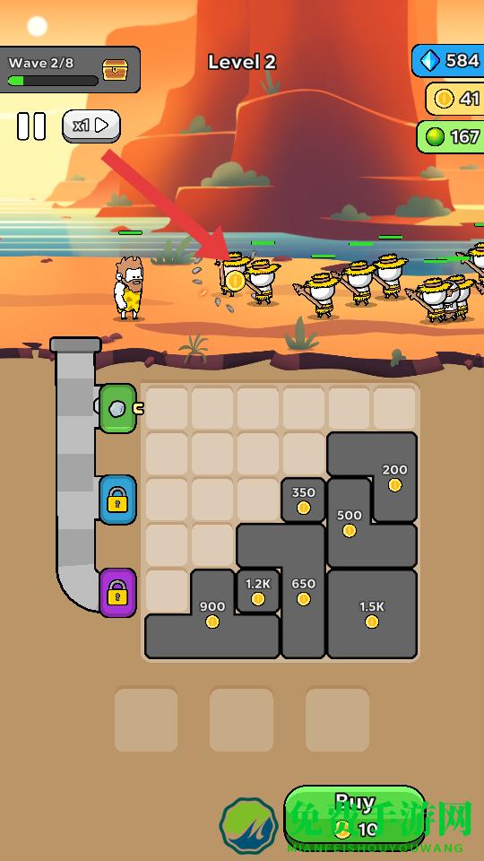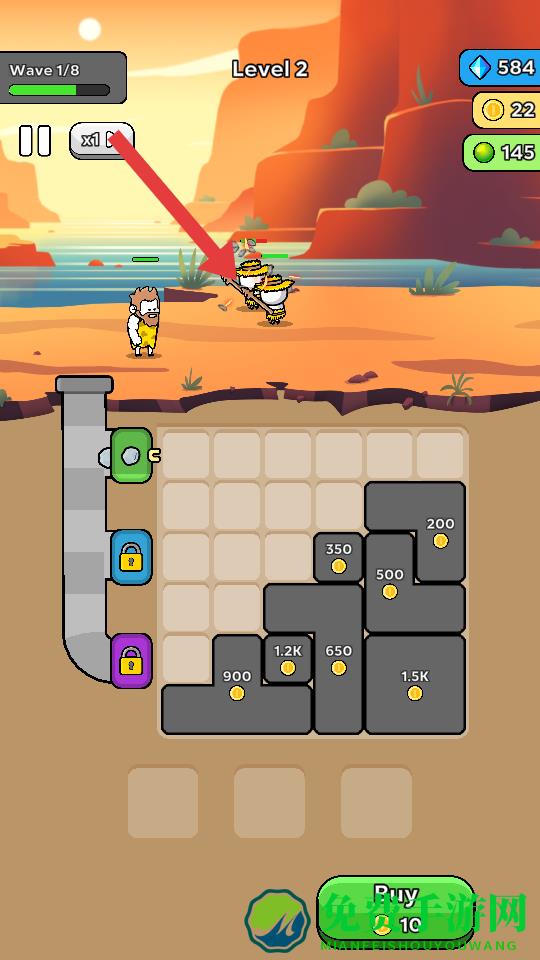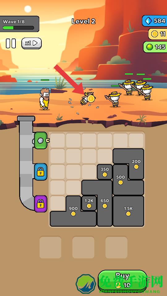 1、在Level2的沙漠场景中,操控角色攻击敌方单位,获取金币奖励,金币可用于解锁下方的灰色区块,挖掘资源。