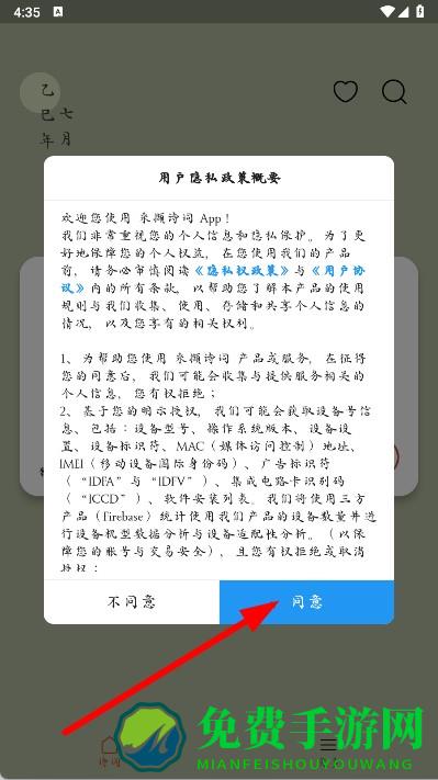1、在弹窗中点击同意,接受隐私政策和用户协议。