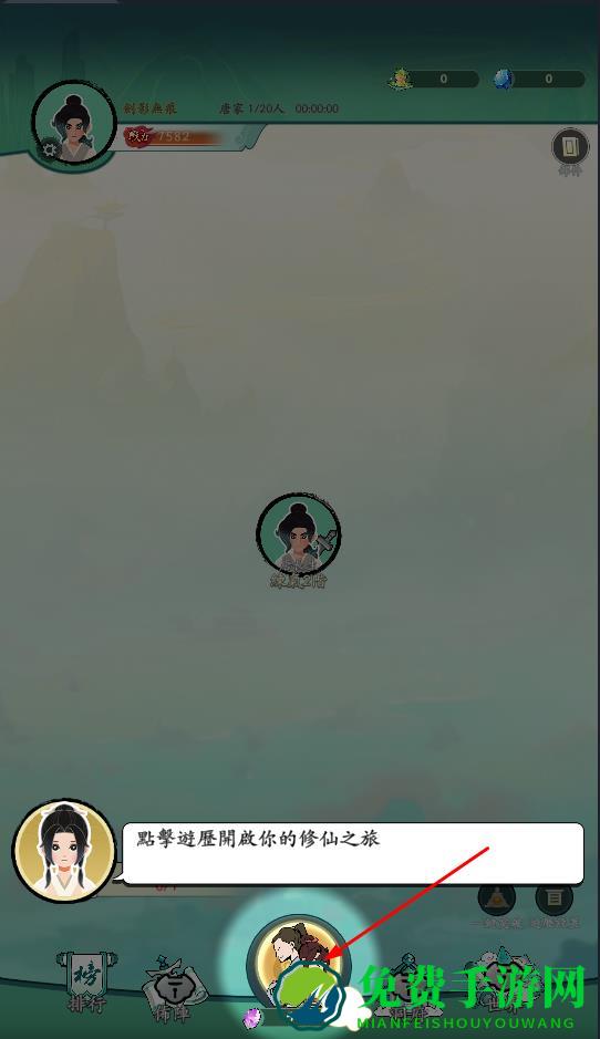 1、在修仙游戏中,点击游历按钮开启修仙之旅,这是探索游戏世界、触发剧情的基础操作,展示角色功能按钮。