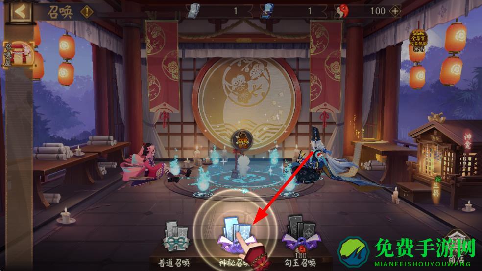 1、进入阴阳师的召唤屋界面后点击神秘召唤选项。