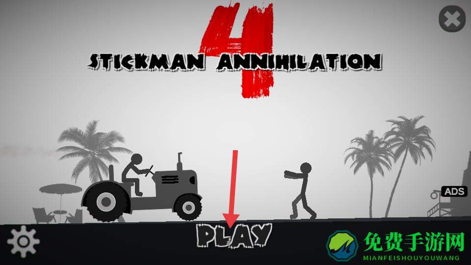 1、在游戏的开始界面,点击PLAY按钮进入游戏,开启火柴人破坏的冒险之旅,界面中展示了拖拉机和火柴人元素。
