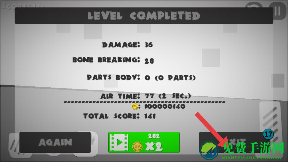 4、完成关卡后,点击EXIT按钮退出关卡,界面中展示了关卡的各项数据,如伤害、骨折数等,根据总结游戏。