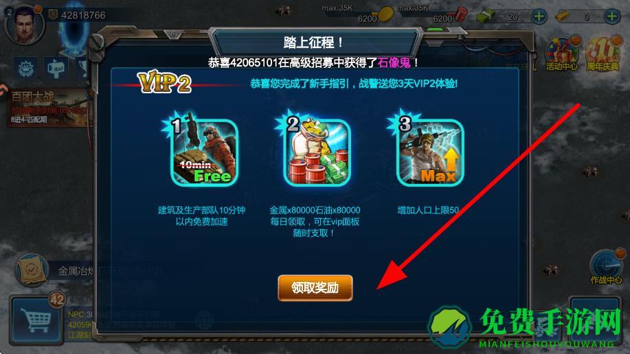 2、完成新手指引后,会获得VIP体验等奖励,点击领取奖励按钮,能获取加速道具、资源以及人口上限提升等福利,这些福利能助力基地更快发展。