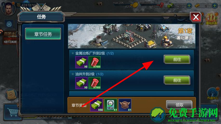 3、任务界面,会有章节任务,比如将金属冶炼厂、油井升到指定等级,点击前往按钮,可快速到达对应建筑处进行升级操作,完成任务能获得资源、道具等奖励。