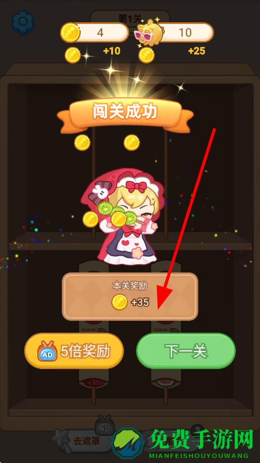 3、当成功完成一关的糖葫芦串制作后,会显示闯关成功,同时获得相应奖励,此时可点击下一关,继续挑战更有难度的关卡,体验不同的制作任务。