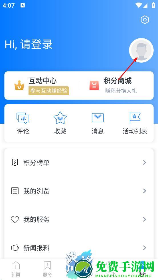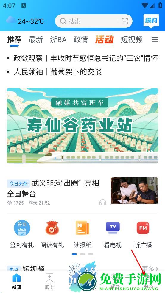 1、打开武义新闻APP,在主界面右下角找到“我的”选项,点击它,进入个人相关页面。