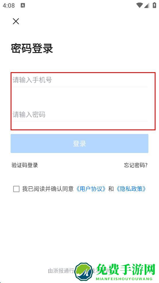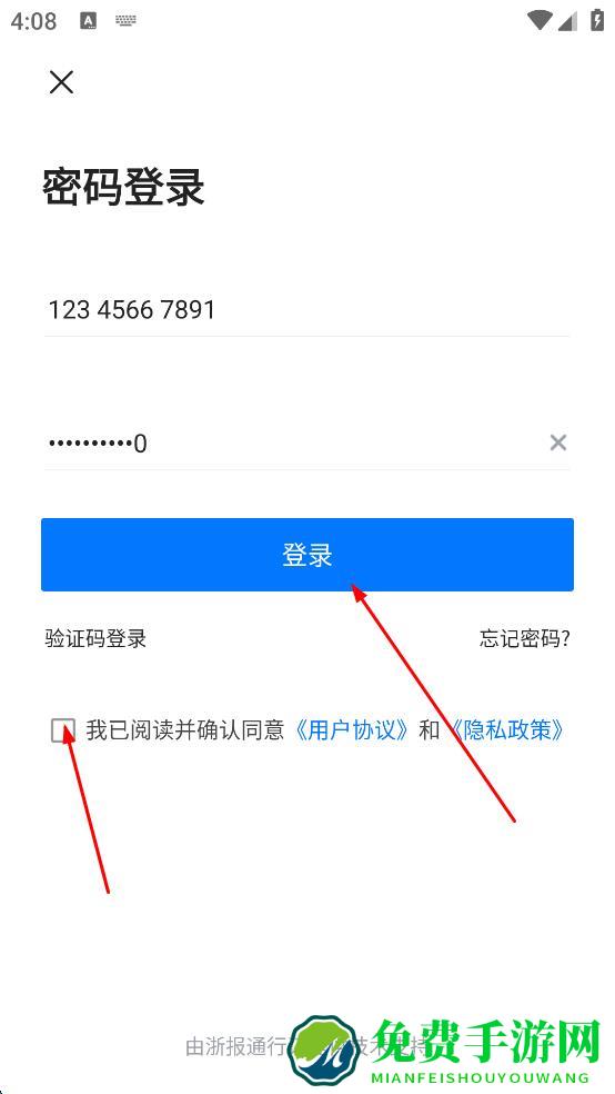 3、在登录界面,选择密码登录方式,输入手机号,接着输入密码,然后勾选“我已阅读并确认同意用户协议和隐私政策。
