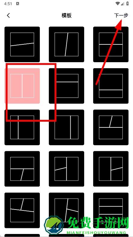 2、选择一个喜欢的拼图模板,点击右上角的下一步。