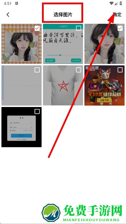 3、进入选择图片界面,勾选要拼接的图片,点击确定。