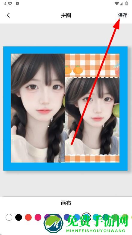 4、选择画布颜色对拼图进行调整,完成后点击右上角的保存,即可将拼图保存到手机相册。