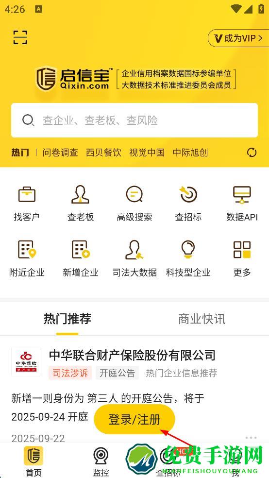 1、打开启信宝APP,进入首页后,点击登录/注册按钮,进入登录页面。