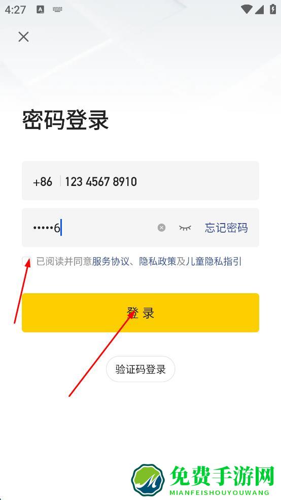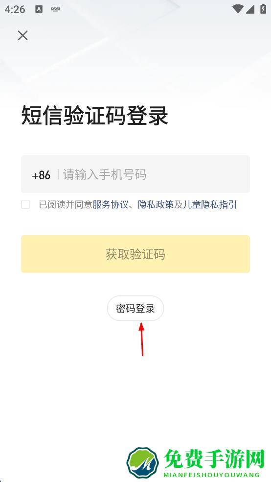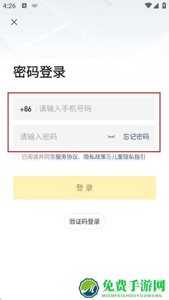 3、在密码登录界面,输入手机号码和密码,勾选已阅读并同意服务协议、隐私政策及儿童隐私指引。