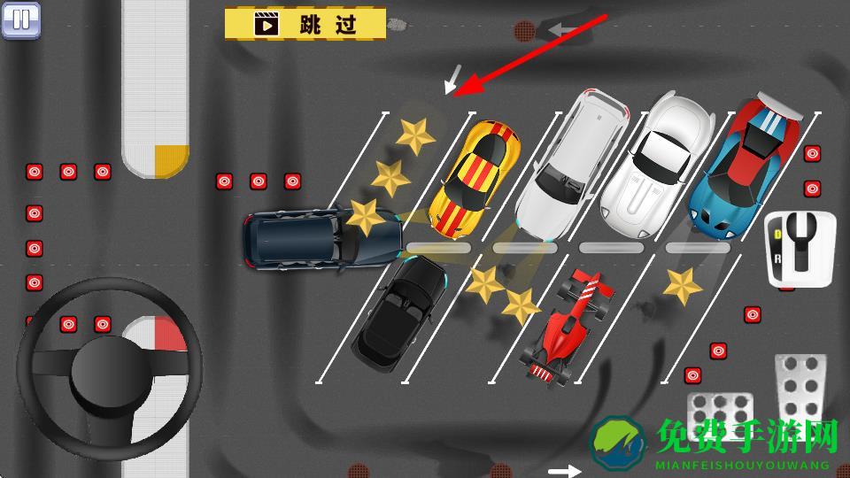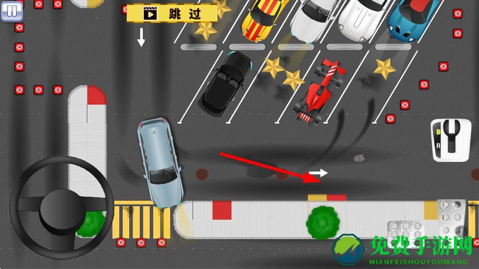 1、在停车场场景中,观察箭头指向的车辆,操控移动时需避开其他停放车辆,朝着箭头指示方向行驶,通过该区域。